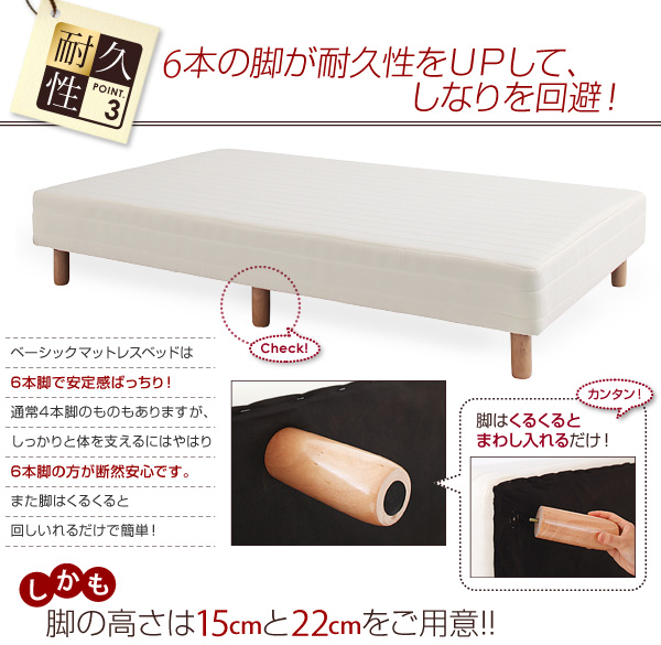 ベーシックボンネルコイルマットレスベッドは6本脚で安定感ばっちり!通常4本脚のものもありますが、しっかりと体を支えるにはやはり6本脚の方が断然安心です。また脚はくるくると回しいれるだけで簡単!