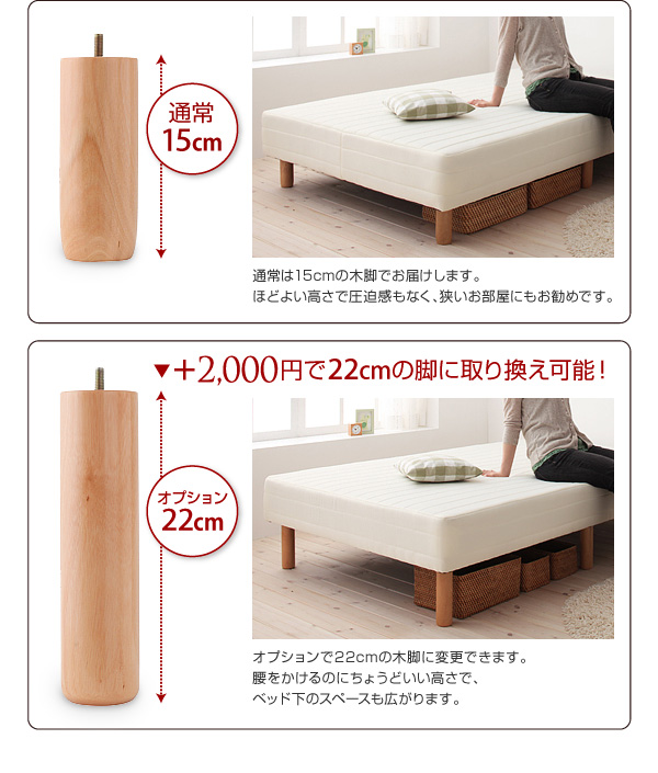 オプション:22cm/オプションで22cmの木脚に変更できます。腰をかけるのにちょうどいい高さで、ベッド下のスペースも広がります。