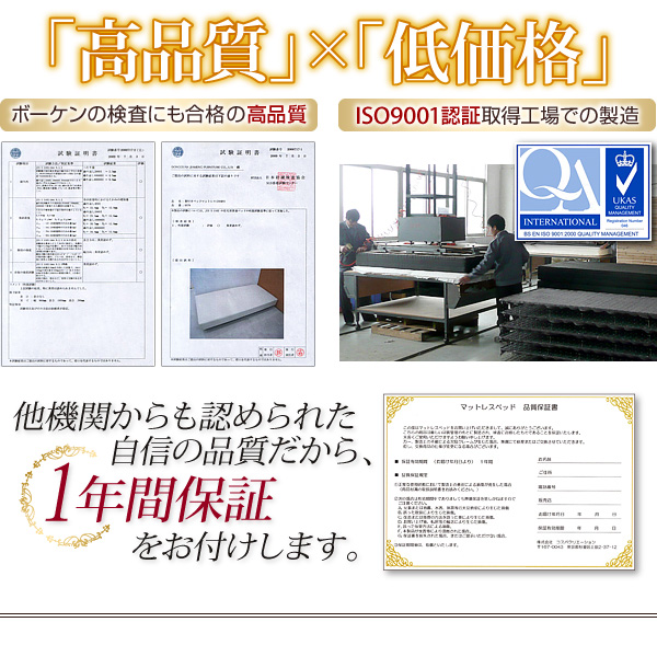 ベーシックポケットコイルマットレスベッドは、ISO9001認証取得工場で製造。国産基準規格であるISO9001:2008を取得、国際的に保証されています。