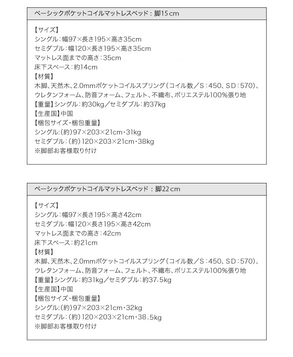 ●ベーシックボンネルコイルマットレスベッド:脚22cm●