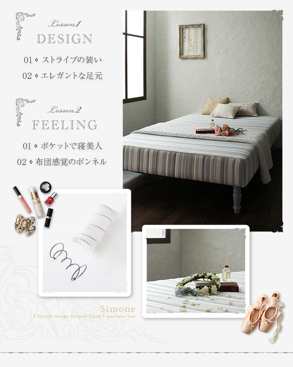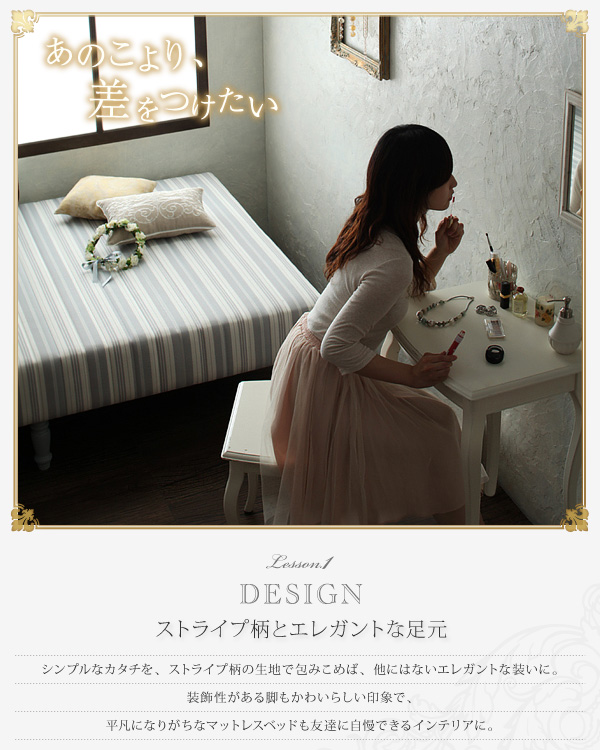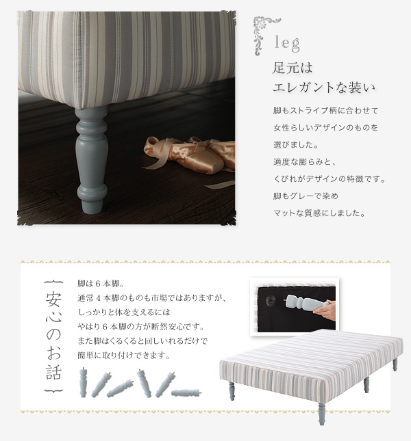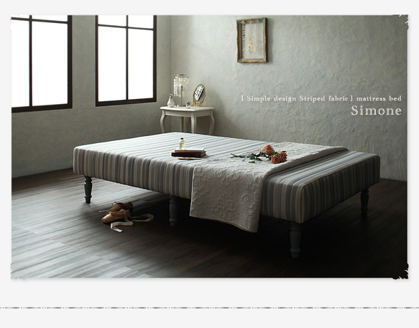 シンプルなカタチを、ストライプ柄の生地で包み込めば、他にはないエレガントな装いに。装飾性がある脚もかわいらしい印象で、平凡になりがちなマットレスベッドも友達に自慢できるインテリアに。