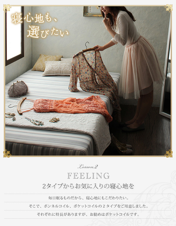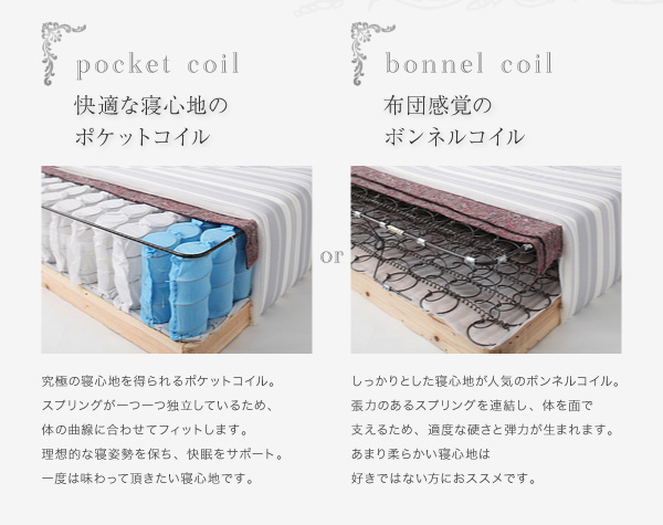 毎日眠るものだから、寝心地にもこだわりたい。そこで、ボンネルコイル、ポケットコイルの2タイプをご用意しました。それぞれに特長がありますが、お勧めはポケットコイルです。