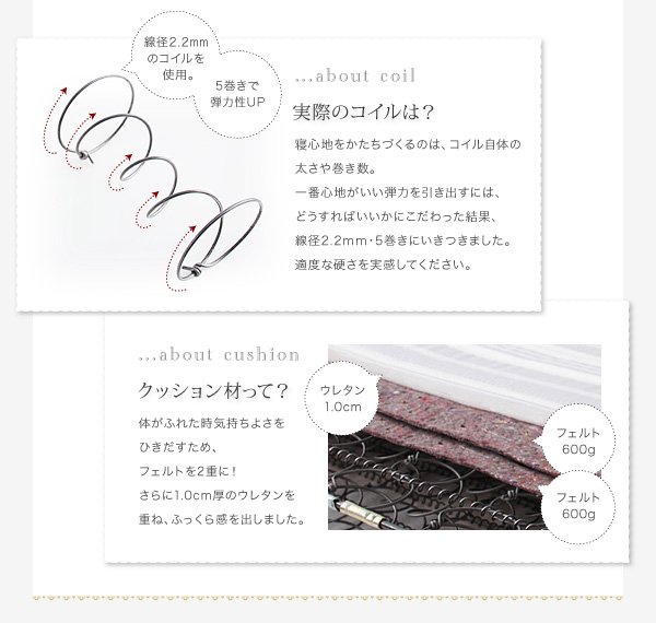 寝心地をかたちづくるのは、コイル自体の太さや巻き数。一番心地がいい弾力を引き出すには、どうすればいいかにこだわった結果、線径2.2mm・5巻きにいきつきました。適度な硬さを実感してください。
