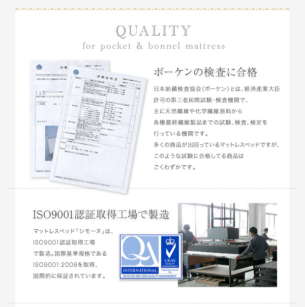 マットレスベッド「シモーヌ」は、ISO9001認証取得工場で製造。国際基準規格であるISO9001:2008を取得、国際的に保証されています。