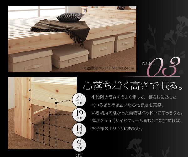 4段階の高さをうまく使って、暮らしにあったくつろぎと行き届いた心地良さを実感。いき場所のなかった荷物はベッド下にすっきりと。高さ21cmに設定すれば、お子様の上り下りにも安心。