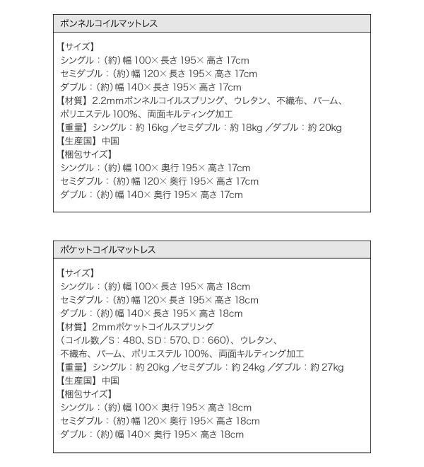 2mmポケットコイルスプリング(コイル数/S:480、SD:570、D:660)、ウレタン、不織布、パーム、ポリエステル100%、両面キルティング加工