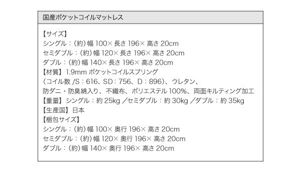 1.9mmボンネルコイルスプリング(コイル数/S:616、SD:756、D:896)、ウレタン、防ダニ・防臭綿入り、不織布、ポリエステル100%、両面キルティング加工