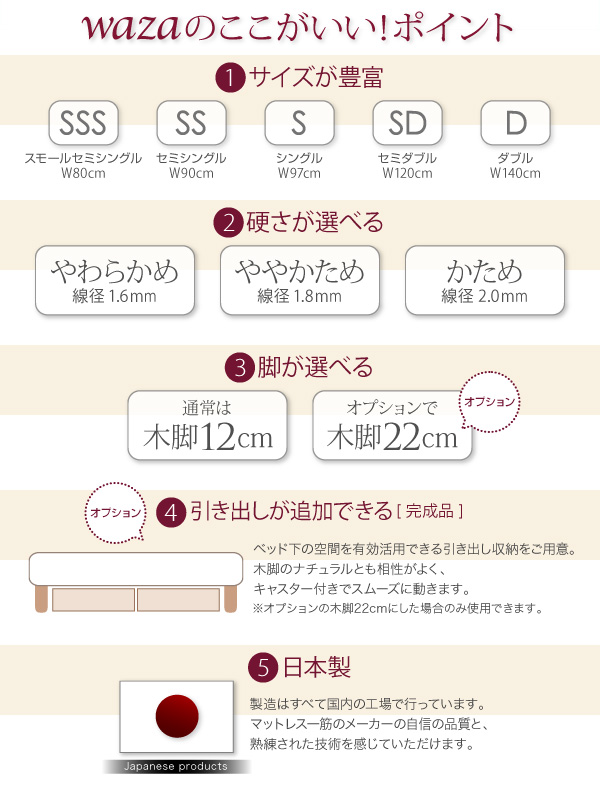 Wazaのマットレスベッドは3つの硬さから自分にあった寝心地を選べます。体格や体重、好みなどによりスプリングの感覚は人それぞれ。できるだけご自分にあったスプリングで眠って頂きたいので、3種類の硬さをご用意しました。
