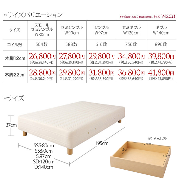 セミシングル:幅90×長さ195×高さ37cm