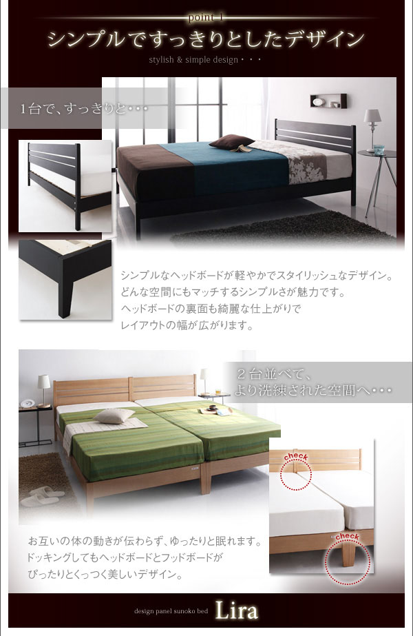 2台並べて、より洗練された空間へ・・・お互いの体の動きが伝わらず、ゆったりと眠れます。ドッキングしてもヘッドボードとフッドボードがぴったりとくっつく美しいデザイン。
