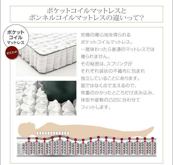 究極の寝心地を得られるポケットコイルマットレス。一度味わったら普通のマットレスはでは寝られません。その秘密は、スプリングがそれぞれ袋状の不織布に包まれ独立しているので、荷重のかかった場所だけが沈み込む構造だから。面ではなく点で支えるので、荷重のかかったところだけ沈み込み、体型や姿勢の凸凹に合わせてフィットします。