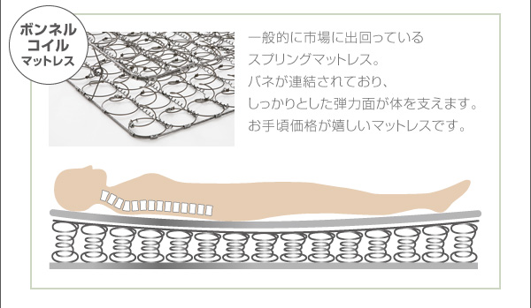 一般的に市場に出回っているスプリングマットレス。バネが連結されており、しっかりとした弾力面が体を支えます。お手頃価格が嬉しいマットレスです。