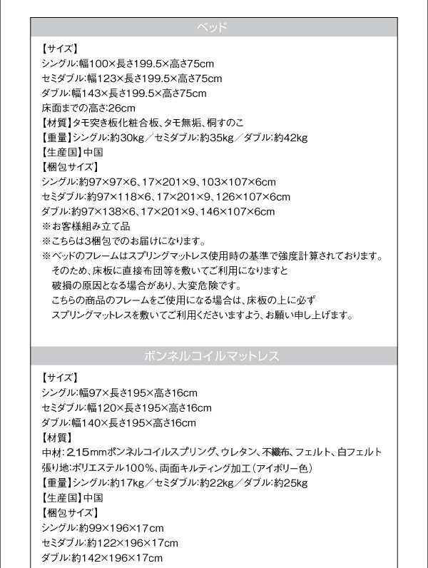 ※ベッドのフレームはスプリングマットレス使用時の基準で強度計算されております。そのため、床板に直接布団等を敷いてご利用になりますと破損の原因となる場合があり、大変危険です。こちらの商品のフレームをご使用になる場合は、床板の上に必ずスプリングマットレスを敷いてご利用くださいますよう、お願い申しあげます。