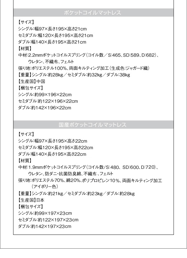フレームのみ、ボンネルコイルマットレス付、中国製・日本製(抗菌防臭、防ダニ)のポケットコイルマットレス付をご用意。シングル・セミダブル・ダブルの3サイズ。